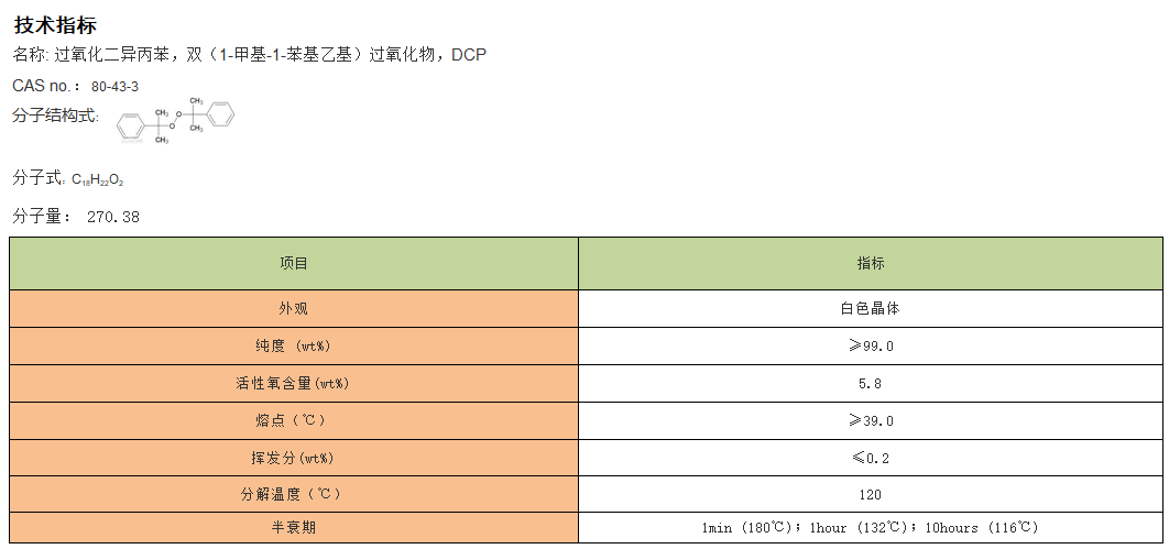 过氧化二异丙苯(DCP)主要用于聚合物和弹性体的生产过程中,常用作天然胶、合成胶、聚乙烯树脂的硫化机或交联剂。DCP为白色晶体,不溶于水,可溶于乙醇、乙醚、苯和其他有机溶剂。在真空中可升华。