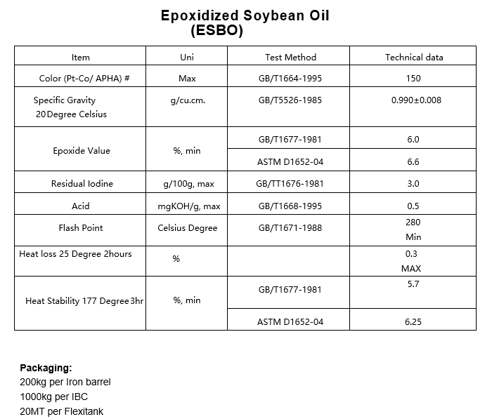 ESBO是一种使用最广泛的聚氯乙烯无毒增塑剂兼稳定剂。与PVC树脂相容性好,挥发性低,迁移性小,具有优良的热稳定性和光稳定性,耐水性和耐油性亦佳,可赋予制品良好的机械强度,耐候性及电性能,且无毒性,是国际认可的用于食品包装材料的化学工艺助剂。本品可用于所有的聚、氯、乙、烯制品,如各类食品包装材料、医用制品、各种薄膜、片材、管材、冰箱封条、人造革、地板革、塑料壁纸、电线电缆及其它日用塑料制品等,还可用于特种油墨、油漆、涂料、合成橡胶以及液体复合稳定剂等。一般环氧值越高,耐热性越好,碘价越低不容易析出.