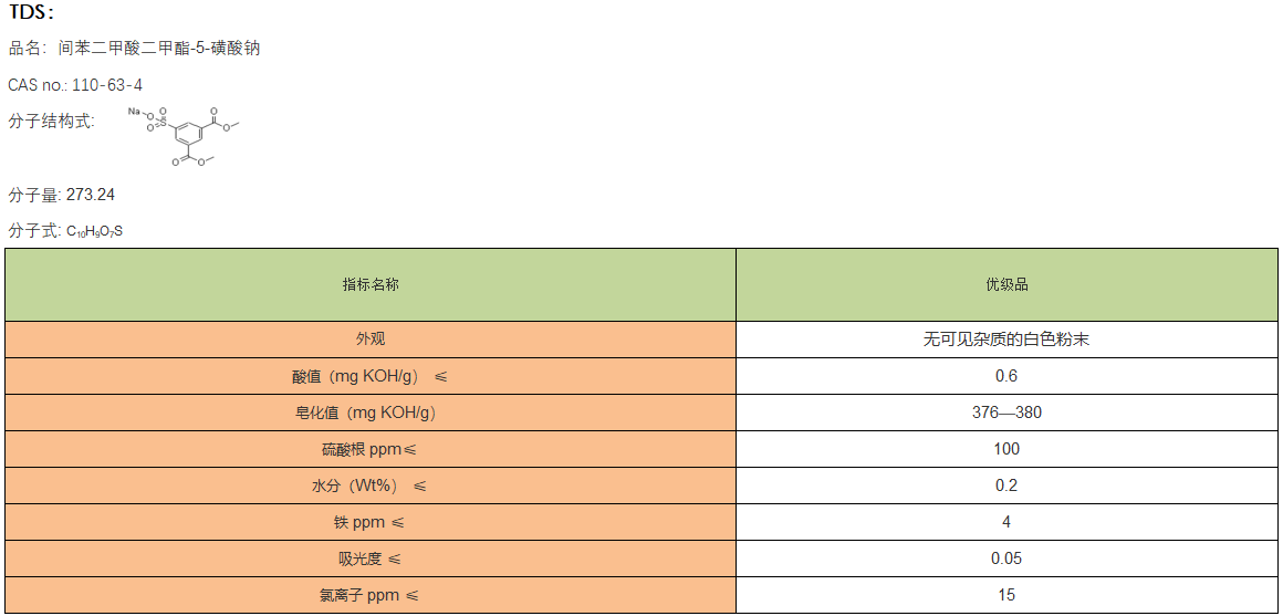 用途:间苯二甲酸二甲酯-5-磺酸钠(SIPM)主要用于涤纶、胶片等方面。其中涤纶是主要的应用领域,主要作为阳离子改性聚酯CDP的第三单体。由于CDP纤维中含有磺酸基,所以对阳离子染料具有良好的亲和性能,其染色的纤维色泽鲜艳、色谱齐全并可深染,因而这种纤维在国外发展很快,其中日本、美国改性聚酯纤维占总产量15%以上。改性的纤维具有毛型感,易于羊毛混纺,适用于冬季男女服装的面料。