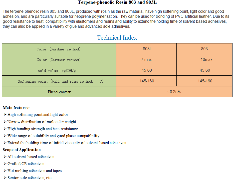 | The terpene-phenolic resin 803 and 803L, produced with rosin as the raw material, have high softening point, light color and good adhesion, and are particularly suitable for neoprene polymerization. They can be used for bonding of PVC artificial leather. Due to its good resistance to heat, compatibility with elastomers and resins and ability to extend the holding time of solvent-based adhesives, they can also be applied in a variety of glue and advanced sole adhesives. | ||