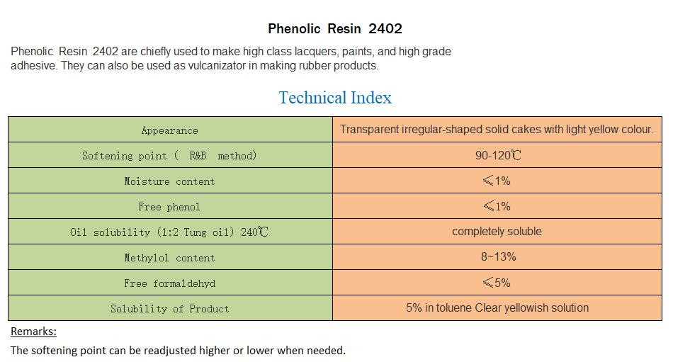 | Phenolic Resin 2402 are chiefly used to make high class lacquers, paints, and high grade adhesive. They can also be used as vulcanizator in making rubber products. | ||
