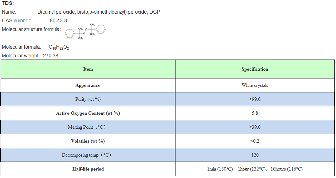 Dicumyl peroxide is primarily used in the manufacture of polymers and elastomers. White crystal, insoluble in water, dissolving in alcohol, ether, benzene, and other organic solvents. Sublimable in high vacuum.