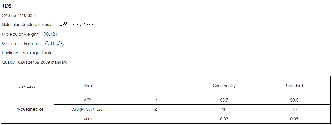 The BDO is colorless oily liquid,combustible,miscible with water, soluble in methyl alcohol, ethanol or acetone, sparing soluble in diethyl ether, Hygroscopic, bitter in taste. The boiling point is 228℃,the freezing point is 20.1℃,the melting point is 20.2℃,the relative density is 1.0171(20/4℃), the opening flash point is 121℃,the ignition point is 370℃,the refractive index is 1.446.